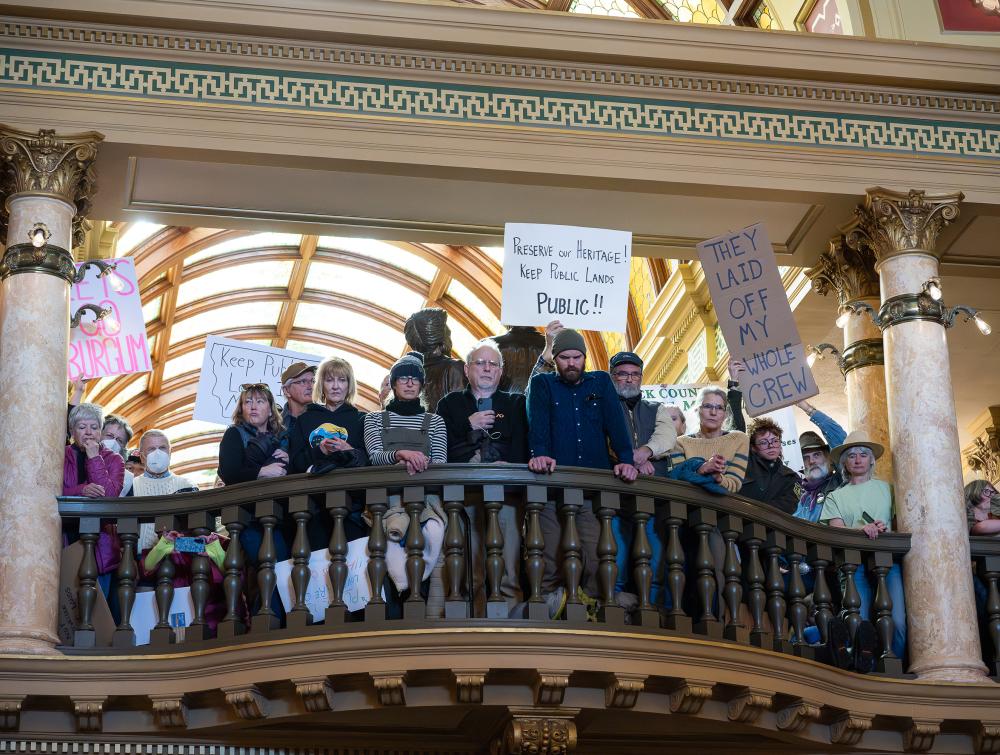 Local citizens protest against terminations and attacks on public lands at a rally in Helena, Montana.